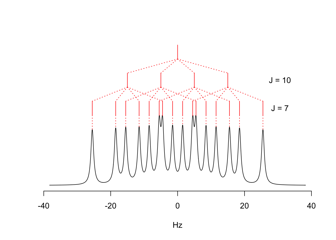 I’ve been very busy with some other projects lately, but my obsession with NMR got the best of me when I saw this post by the Q Magnetics folks. So I decided to modify the multiplet function to handle nuclei with spin > 1/2. Along the way I re-wrote the internals to be more robust and logical (sometimes my first pass can be, shall we say, clunky). Also modified some of the aesthetics of the J-tree slightly. Here’s a couple of examples with I > 1/2.